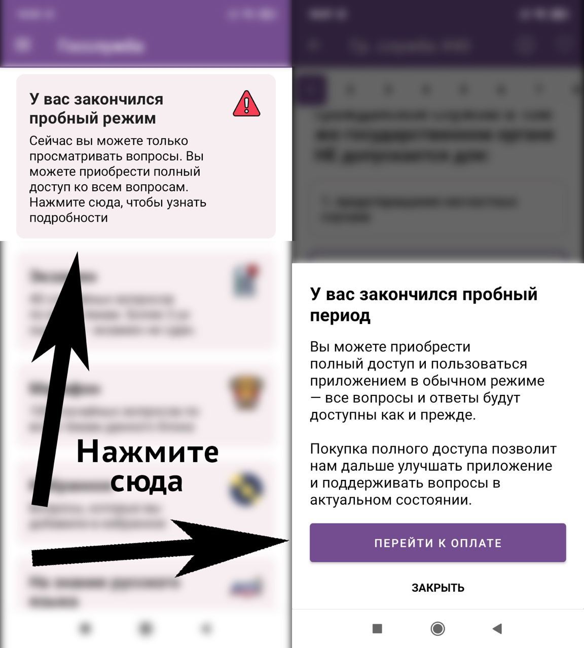 1. Нажмите на самый верхний элемент в главном меню приложения. Либо нажмите на кнопку «перейти к оплате» во время прохождения теста.