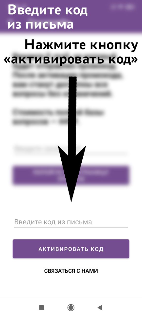 При первом заходе в приложение выдаётся пробный доступ. После прорешивания 40 вопросов доступ будет заблокирован, чтобы разблокировать доступ нужно приобрести код и ввести его, выполнив шаги ниже.
